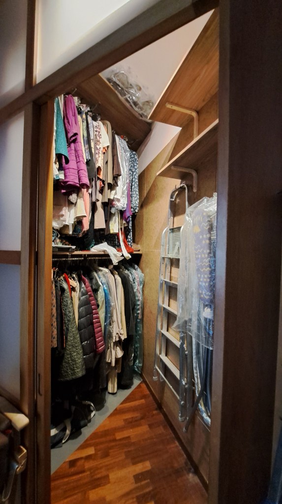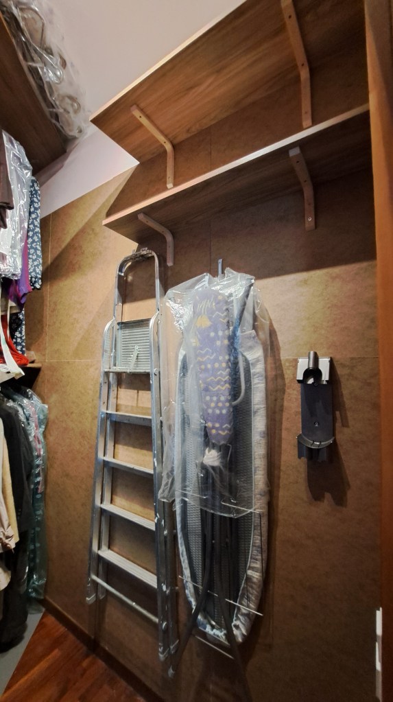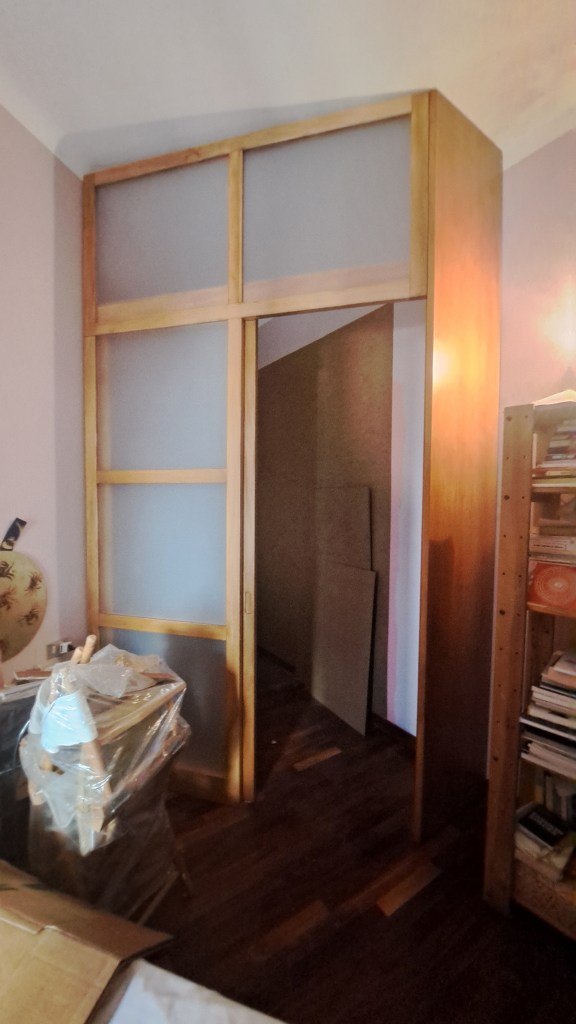 Dopo aver tinteggiato tutta la camera, ho fatto realizzare dalla falegnameria di fiducia una parete di chiusura con telaio in legno e inserti in plexiglass satinato. Nel frattempo ho rivestito i muri all’interno dello spazio con pannelli in fibra e una volta installata la porta scorrevole ho attrezzato le due pareti con mensole tagliate a misura e supporti vari in base alle esigenze del cliente.